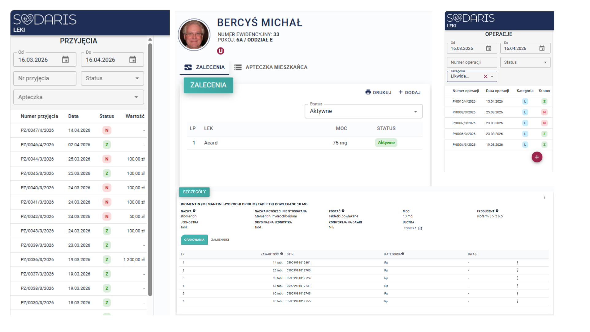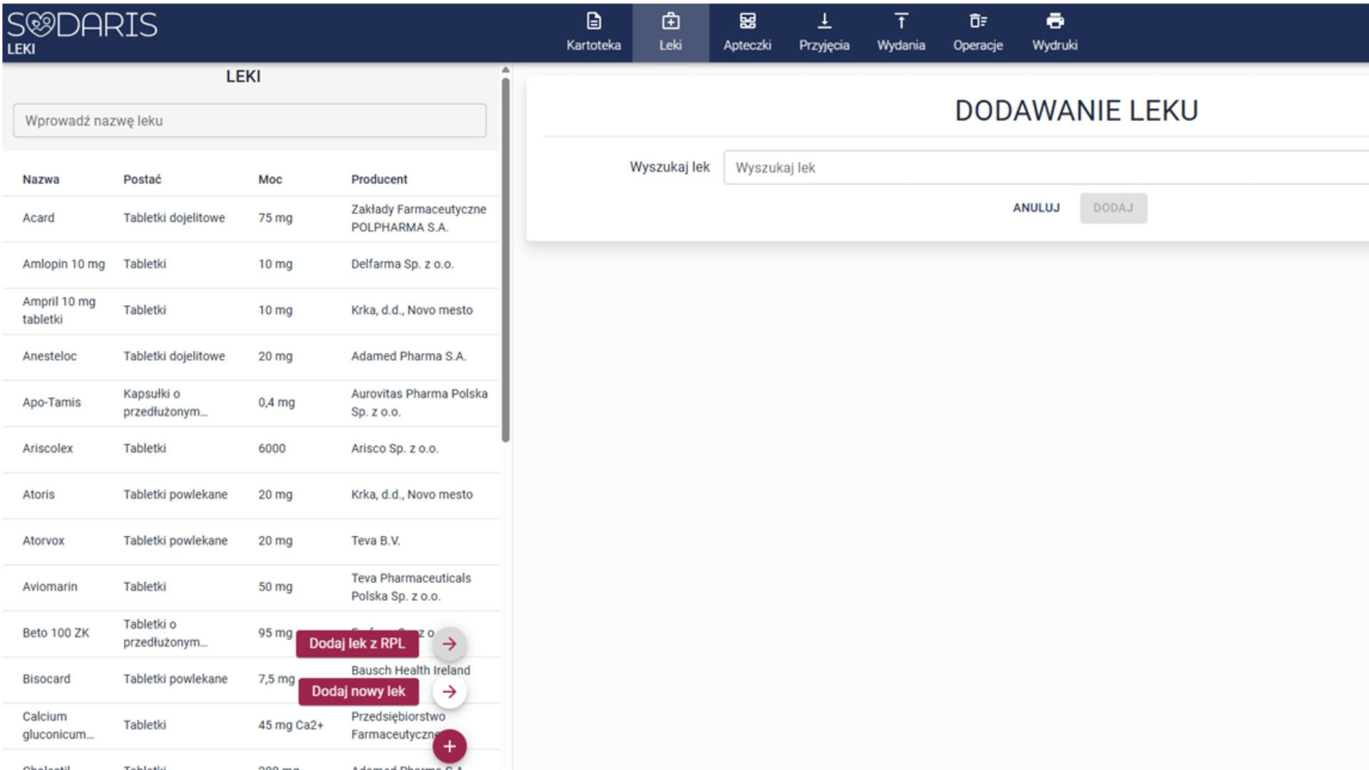 Pozawala na ewidencję zaleceń, przyjęć, automatycznych i doraźnych wydań, likwidacji i przekazań leków. Współpracuje z bazą leków w formie ogólnodostępnego Rejestru Produktów Leczniczych - RPL. Pozwala na szybki wgląd w stany lekowe mieszkańców oraz sporządzenie zestawień i wydruków. Wydania mogą być realizowane przy pomocy tabletu. Moduł Leki obsługuje także apteczki dodatkowe tzw. oddziałowe